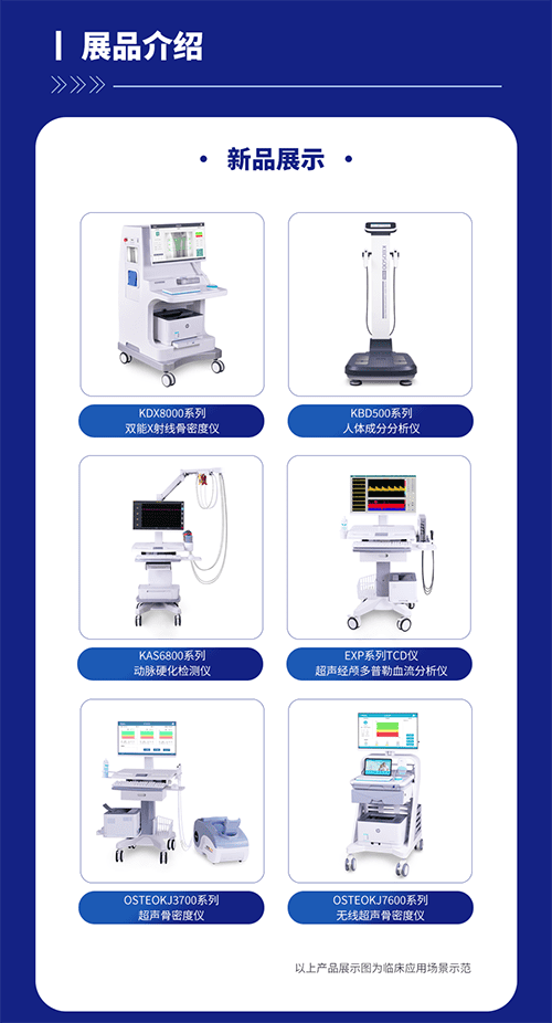 展會現場超聲經顱多普勒血流分析儀、超聲骨密度儀、無線超聲骨密度儀、雙能X射線骨密度儀、動脈硬化檢測儀、人體成分分析儀等產品盡皆亮相,歡迎蒞臨現場參觀體驗。